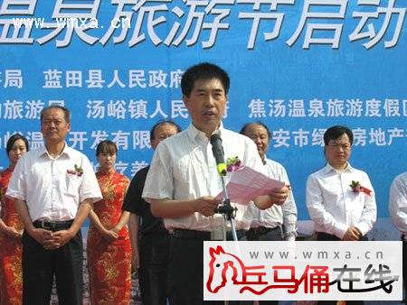 县长苗志忠在致辞中向广大游客推介蓝田旅游资源,并介绍了温泉旅游节的基本情况,他指出,近年来,县委、县政府坚持“一四五五”发展思路,依托蓝田独特的山水资源禀赋和深厚的人文资源优势,以汤峪被陕西省列入秦岭北麓温泉旅游重点开发区域和关中百镇建设重点镇为契机,大力实施焦汤一体化发展战略,着力打造会议会展、观光度假、温泉休闲等特色品牌,相继建成了一批以洗浴、度假、观光、休闲、养生等功能为主的温泉旅游产品,使汤峪成为全省小城镇建设的样板和西安乃至全省极具人气的温泉旅游及投资胜地之一。作为蓝田旅游龙头的汤峪,将会以更加灵秀的新貌,更加隽盈的新姿展现在世人面前,成为人们休闲、度假、怡养、避暑的胜地!