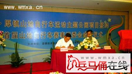 6月29日,由我省蓝德投资集团公司在蓝投资的中国·厚镇山地自行车运动主题公园项目签约仪式在西安金石酒店举行。仪式由合作的厚镇乡和蓝德投资集团公司承办,县四大班子领导和相关部门负责同志,在蓝投资的部分客商,省市县主流新闻媒体参加了仪式,会上还举行了项目筹建处揭牌仪式暨首届山地自行车全民健身运动比赛新闻发布。