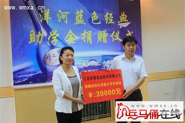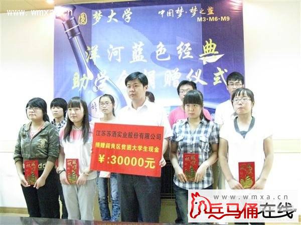 为帮助家庭困难的大学新生顺利迈入大学校门,解决部分贫困学生入学难的问题,8月25日下午3点,阎良团区委和江苏苏酒实业股份有限公司共同开展了2011圆梦大学洋河 蓝色经典爱心助学活动,由江苏苏酒实业股份有限公司提供助学金3万元,对罗璐璐等15名即将迈入大学校园的贫困学生进行了资助。