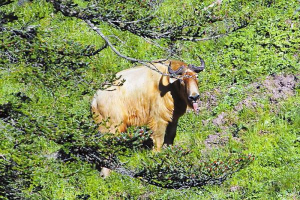 出于这种动物珍稀,加之拍摄难度极大,我跟踪拍摄多年,经常无所收获。羚牛生活于人类活动较少的高山,以防人类的伤害,除非羚牛认为你要伤它才会攻击你,因此人们对羚牛是有误解的。在跟踪拍摄和学习中。我了解了误认为的一些特性。羚牛毛色依老幼而不同,一般为白色或黄白色,幼体棕色,老体金黄色。羚牛前肢粗壮,后腿短而弯曲,偶蹄分叉,非常适应高山攀爬。羚牛的食物以杂草、树叶为主,高山草甸、灌丛、林下生长的灌木、幼树、嫩草及乔木树皮都是它的美味佳肴。它还喜舔食岩盐及硝盐,以满足生活习性和生理机能对盐分的需要。羚牛生性怕热不怕冷,一般晨昏觅食,中午隐匿于林木灌丛中休息。