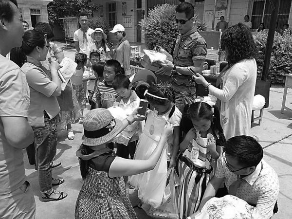 在操场上,二年级的王元帅仔细端详着刚收到的遥控飞机激动地一直说:“谢谢阿姨叔叔。”四年级的周佳乐抱着自己梦想的大白熊小脸乐开了花,她说今天是最快乐的“六一”儿童节。还有崇拜警察的小男生史恒博穿上了梦寐以求的迷彩装,立刻给大家敬了一个标准的军礼。孩子们还用自己排练已久的节目,来感谢远道而来为自己圆“六一”儿童节梦想的叔叔阿姨们。孩子们晒红了小脸坚持要表演手语《感恩的心》,让在场的所有爱心人士感动不已,有的甚至被孩子们的真诚打动到流泪。
